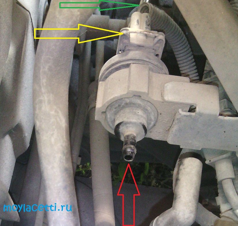 Чтобы снять клапан достаточно сдёрнуть две трубки, отмеченные зелёной и красной стрелкой(красная уже снята, а зелёная плохо видна с этого ракурса). Трубки снимаются просто и легко без всяких фиксаторов.