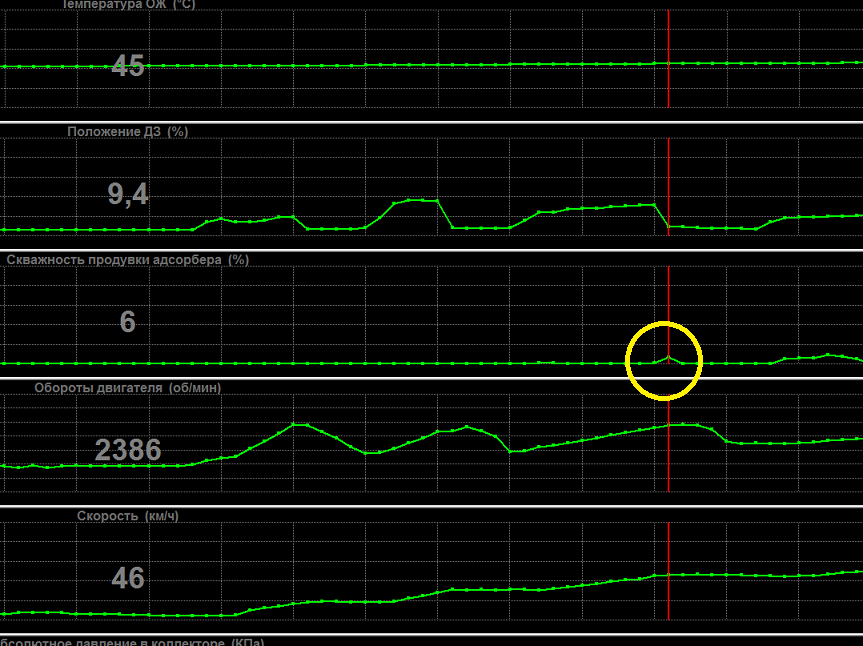 Здрасте, при тестах в проге не выдает такой график до 96% как шла прямая так и идет, но если авто завести через время снять трубку в сторону абсорбера, слышно как щелкает клапан.