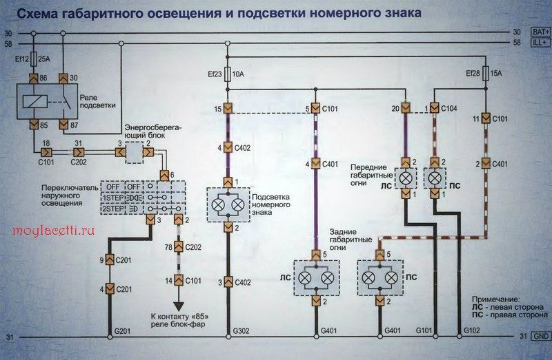 Схема габаритного освещения и подсветки номерного знака Лачетти