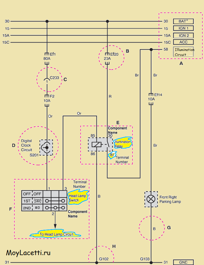 УСЛОВНОЕОБОЗНАЧЕНИЕЗНАЧЕНИЕCРазъемDДиодEfПредохранитель в блоке предохранителей в моторном отсекеFПредохранитель в блоке предохранителей в салоне автомобиляGМассаSКонтактная колодка (соединительный разъем) - Е — Реле и его внутренняя цепь. 85, 86, 87 и 30 — это номера контактов реле. Illumination relay — Реле подсветки. Весь перевод английских обозначений можно посмотреть в здесь Перевод обозначений в схемах автомобилей