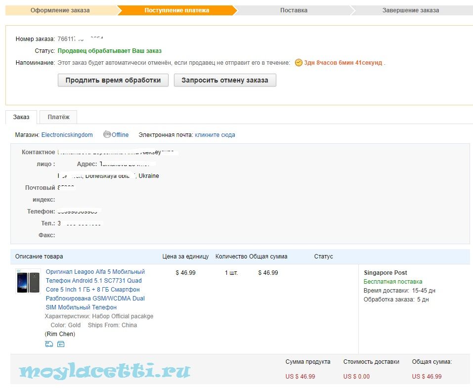 На этом наша миссия окончена и настает время действий продавца. Ему дается пять дней на обработку и отправку заказа. Если он не отправит товар в положенный срок, тогда заказ отменится автоматически. За всем происходящим Вы можете следить в личном кабинете Алиэкспресс. На скриншоте видно, продавец обрабатывает наш заказ и у него осталось на это чуть больше трёх суток.
