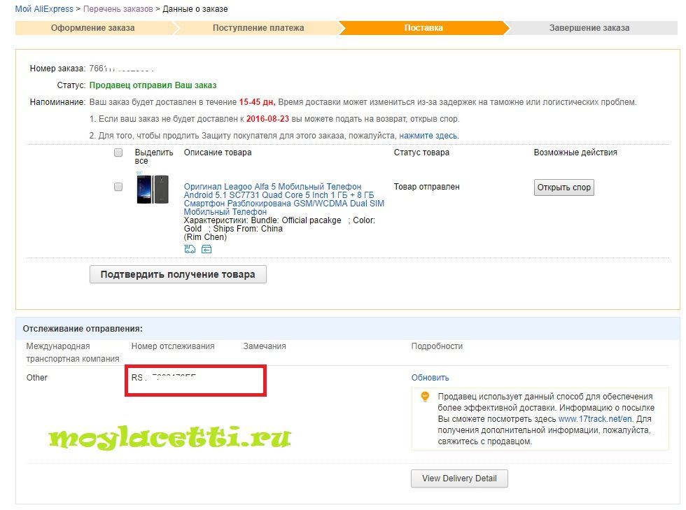Также продавец должен сообщить трек номер посылки (обведено красным), чтобы мы могли отслеживать её местоположение в данный момент.