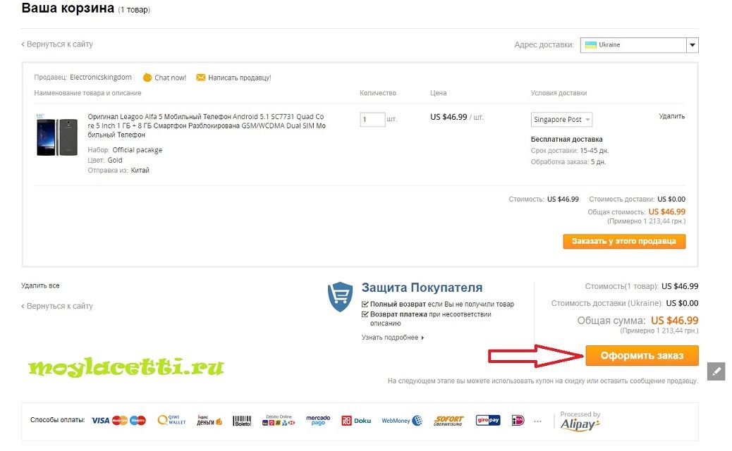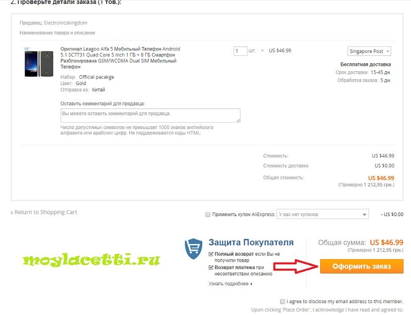 Проверяем, пишем или не пишем продавцу и нажимаем «Оформить заказ»