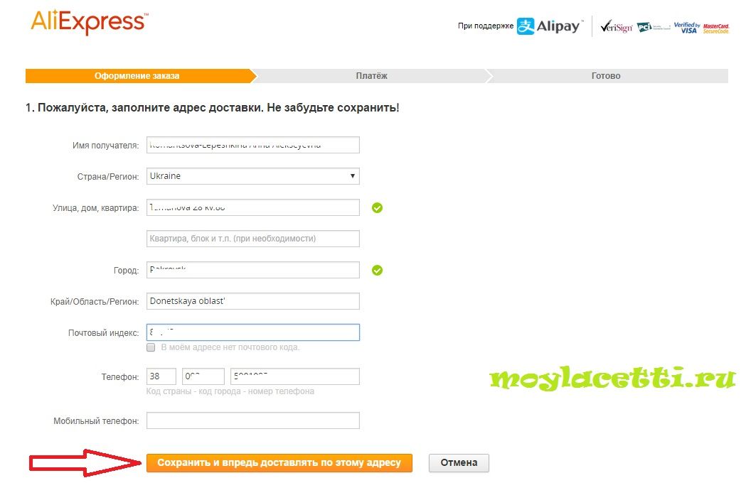 Теперь нас направят на страницу оформления заказа, где первым делом будет предложено ввести наш адрес доставки. Это самый ответственный шаг и ошибки здесь недопустимы! Если, конечно, не хотите, чтобы Ваша посылка приехала к кому-нибудь другому