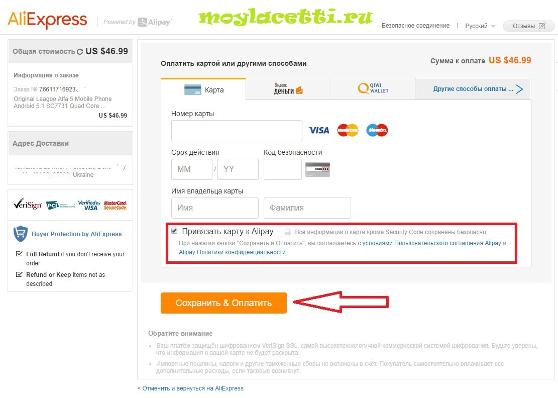 Красным цветом я выделил дополнительную функцию «Привязать карту к Alipay». Эта функция привязывает Вашу карту к Вашему аккаунту на Алиэкспресс, чтобы в будущем при покупках она была средством оплаты по умолчанию. Хотите, ставьте галочку, хотите — нет. Я не ставил, мне не в лень потом ещё раз ввести данные карты при оплате, а на душе как-то спокойней