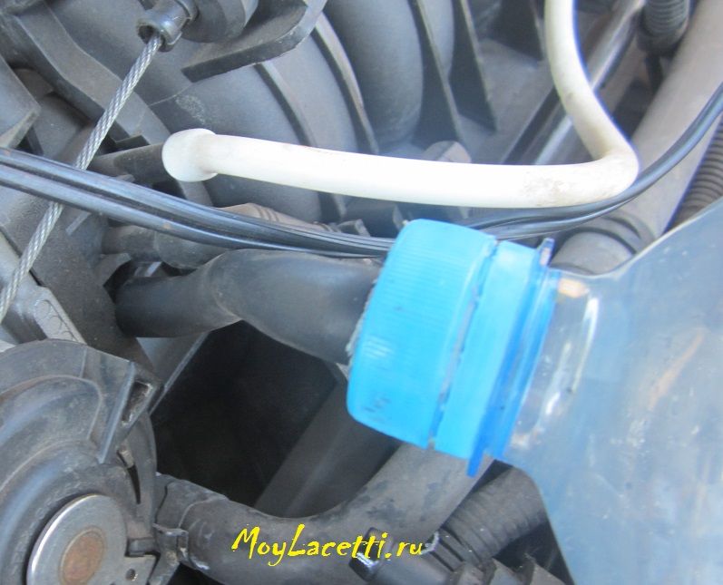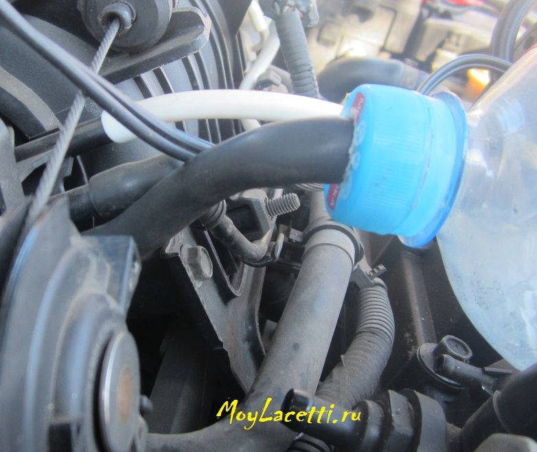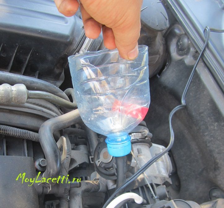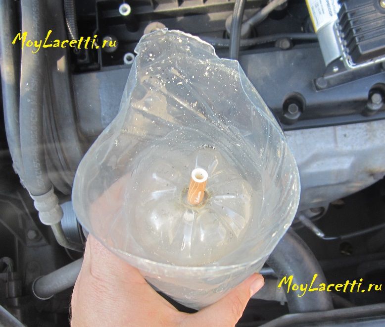 Снял со штуцера клапана вентиляции картера шланг. В крышке от бутылки напильником проделал отверстие, чтобы снятый шланг вошёл в него с усилием. Накрутил на крышку верхнюю часть большой бутылки. Получилась вот такая картина