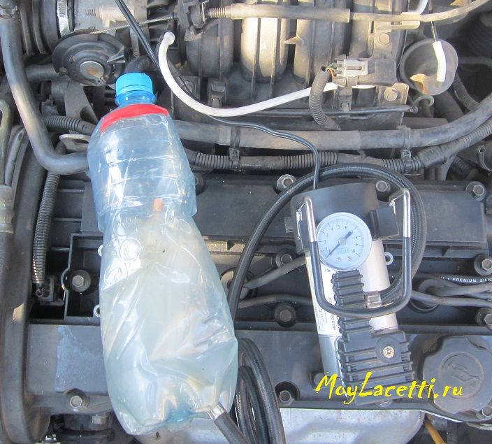Это всё всунул в верхнюю часть бутылки и подключил автомобильный компрессор
