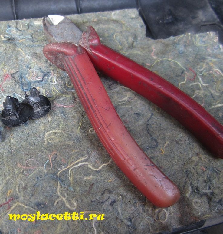 Теперь берём бокорезы или съёмник и вынимаем пластиковые фиксаторы по три штуки на правой и левой обивке