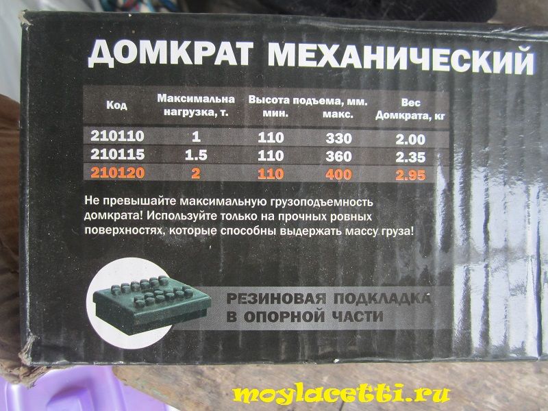 На следующий день я первым делом купил новый домкрат. Какой? Простой механический ромбовидный домкрат грузоподъёмностью две тонны по цене в два раза дешевле бутылочного и в четыре раза подкатного!
