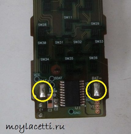 Это места пайки контактных пружин элементов питания. Также стоит уделить внимание контактам светодиода