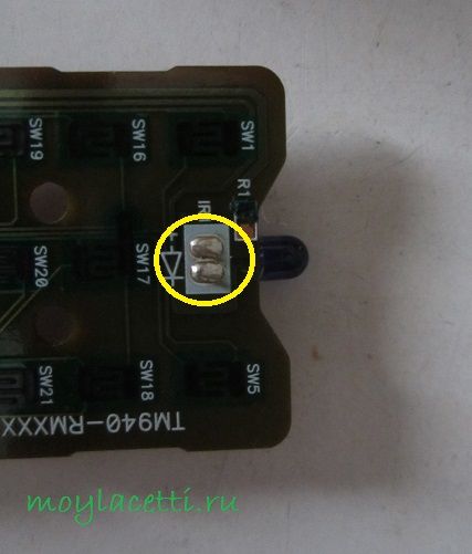 Второй по значимости проблемой, при которой не работает пульт ТВ, являются трещины в пайке и, как правило, пропадание контакта в таких местах. В первую очередь необходимо пропаять места, указанные на фото