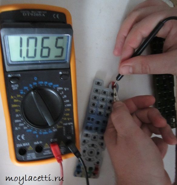 На каждом пятачке есть токопроводящее напыление, обладающее определенным сопротивлением. Его нам и нужно замерить. Оно должно быть практически одинаковое на всех пятачках. Для этого щупы омметра подключаем к краям пятачка и сверяем показания прибора с показаниями на соседних пятачках