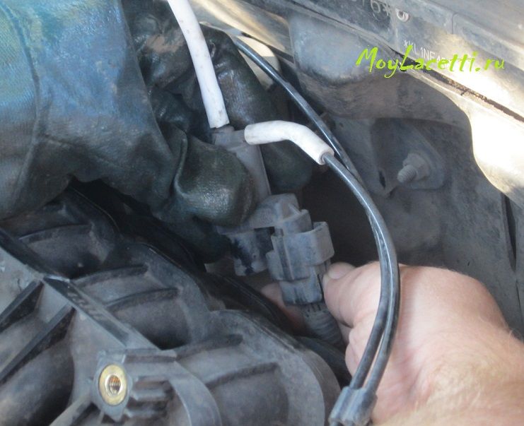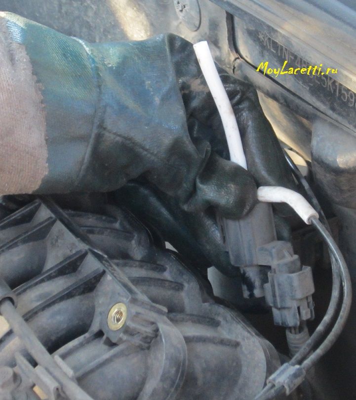 - Отсоединить вакуумную трубку от коллектора, а штуцер на коллекторе заглушить. Внимание!!! Только заглушку нужно искать, которая наденется НА штуцер (например, шланг загнуть и закрепить проволокой, резиновую часть от медицинской пипетки и т.п.), а НЕ в штуцер (спички, зубочистки и т.п.). Нужно именно так для того, чтобы Вашу заглушку не засосало в коллектор! Я использовал загнутый и обжатый проволокой кусочек вакуумного шланга