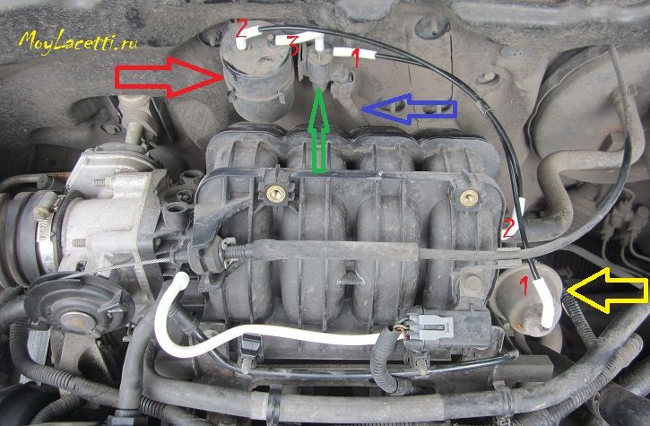 - цифрами — соединительные вакуумные трубки: 1 — от электромагнитного клапана к механизму (пневмокамере), 2 — от коллектора к ресиверу, 3 — от ресивера к клапану.