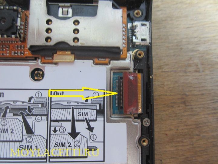Отстёгиваем все мешающие шлейфы. На этом телефоне он всего один — от дисплея